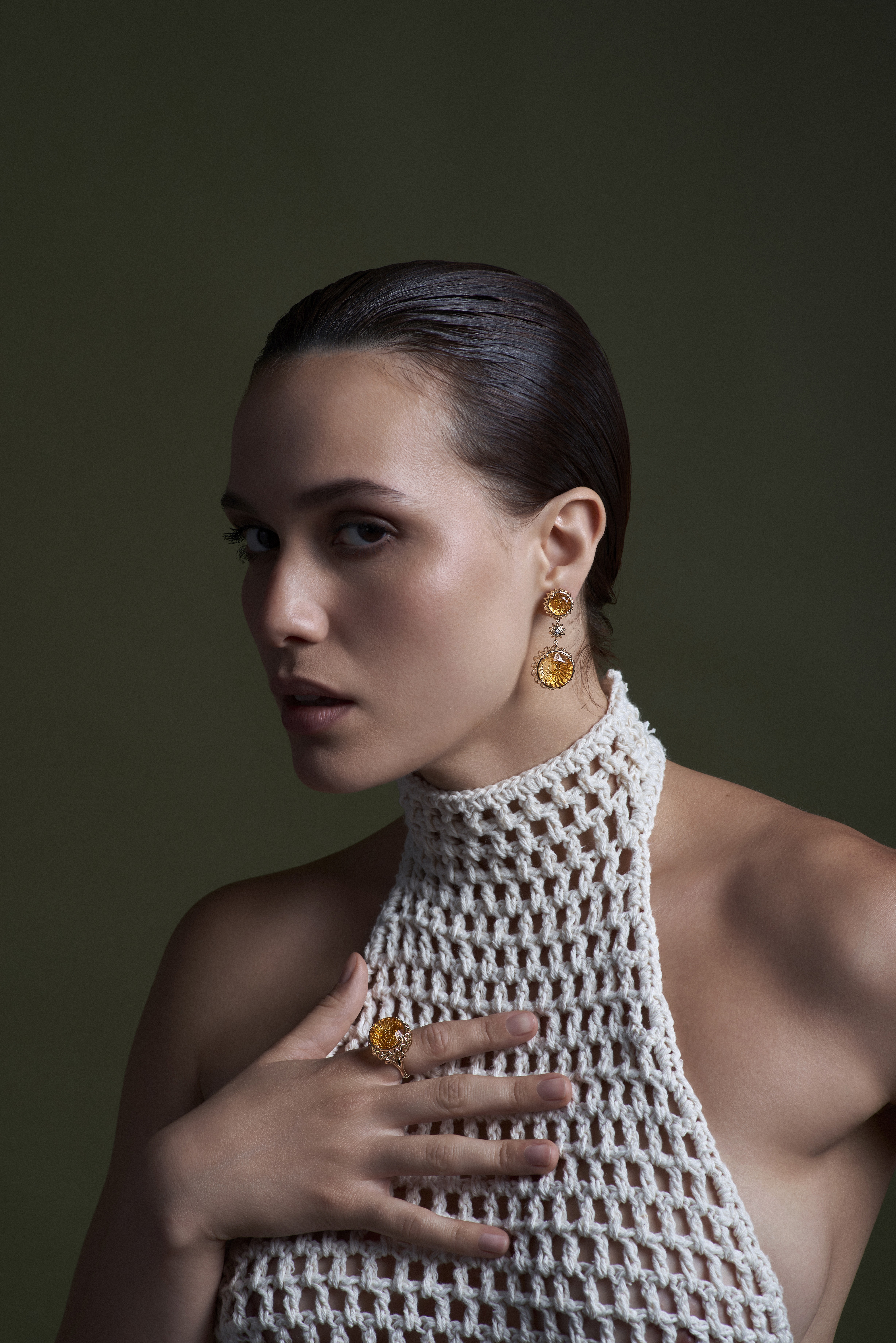 Anel Pomar em ouro amarelo 18k e citrino. A natureza amadurece em silêncio. Entre o dourado das tardes e o perfume dos campos, nasce o pomar esse templo de abundância onde a vida se revela em forma de fruto. Ali, o tempo não corre: ele respira. Cada galho é memória, cada cor é promessa. Chega, então, o instante da colheita quando os frutos se oferecem ao toque, ao olhar e ao gosto.