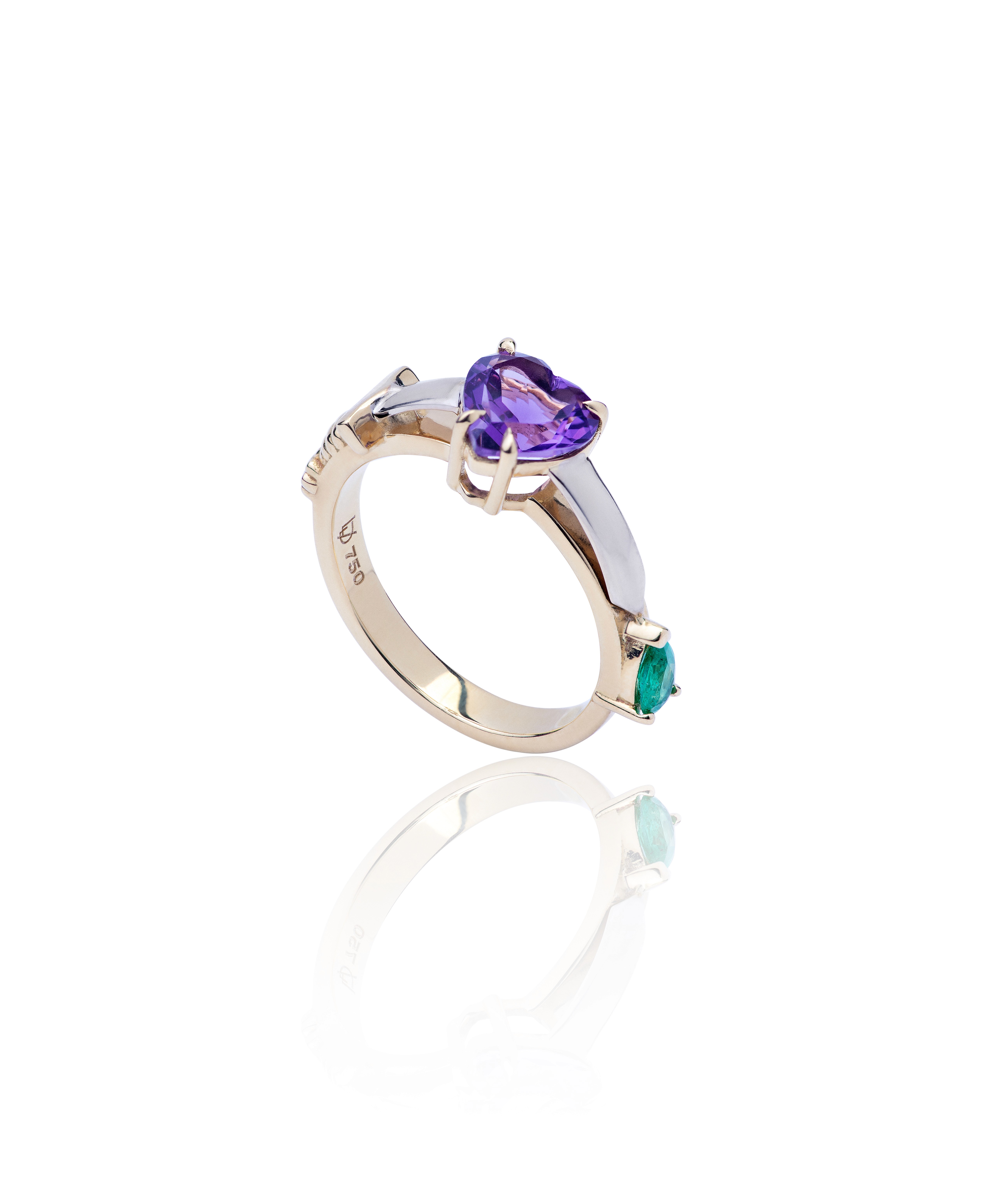 Anel Valentim, em ouro amarelo e branco 18k, granada e esmeralda. Símbolo do amor que atravessa o tempo, São Valentim inspira esta linha que celebra a entrega e a coragem de amar. Assim como o santo que se tornou guardião dos amantes, as joias dessa linha evocam a força de um sentimento que, mesmo ferido, permanece luminoso.