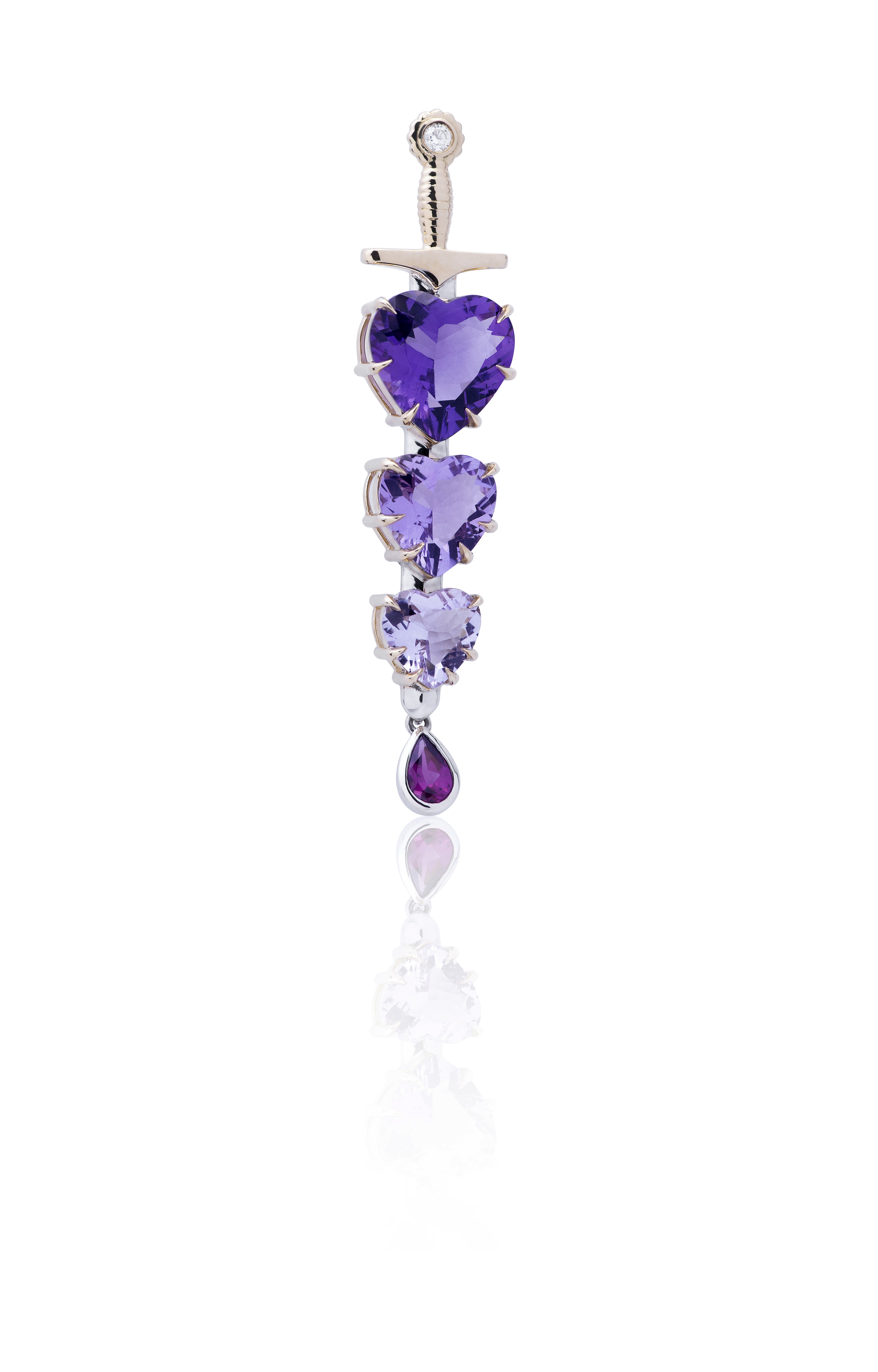 Brochê Valentim em ouro amarelo e branco 18k, amestista, rodolita e diamante. Símbolo do amor que atravessa o tempo, São Valentim inspira esta linha que celebra a entrega e a coragem de amar. Assim como o santo que se tornou guardião dos amantes, as joias dessa linha evocam a força de um sentimento que, mesmo ferido, permanece luminoso.