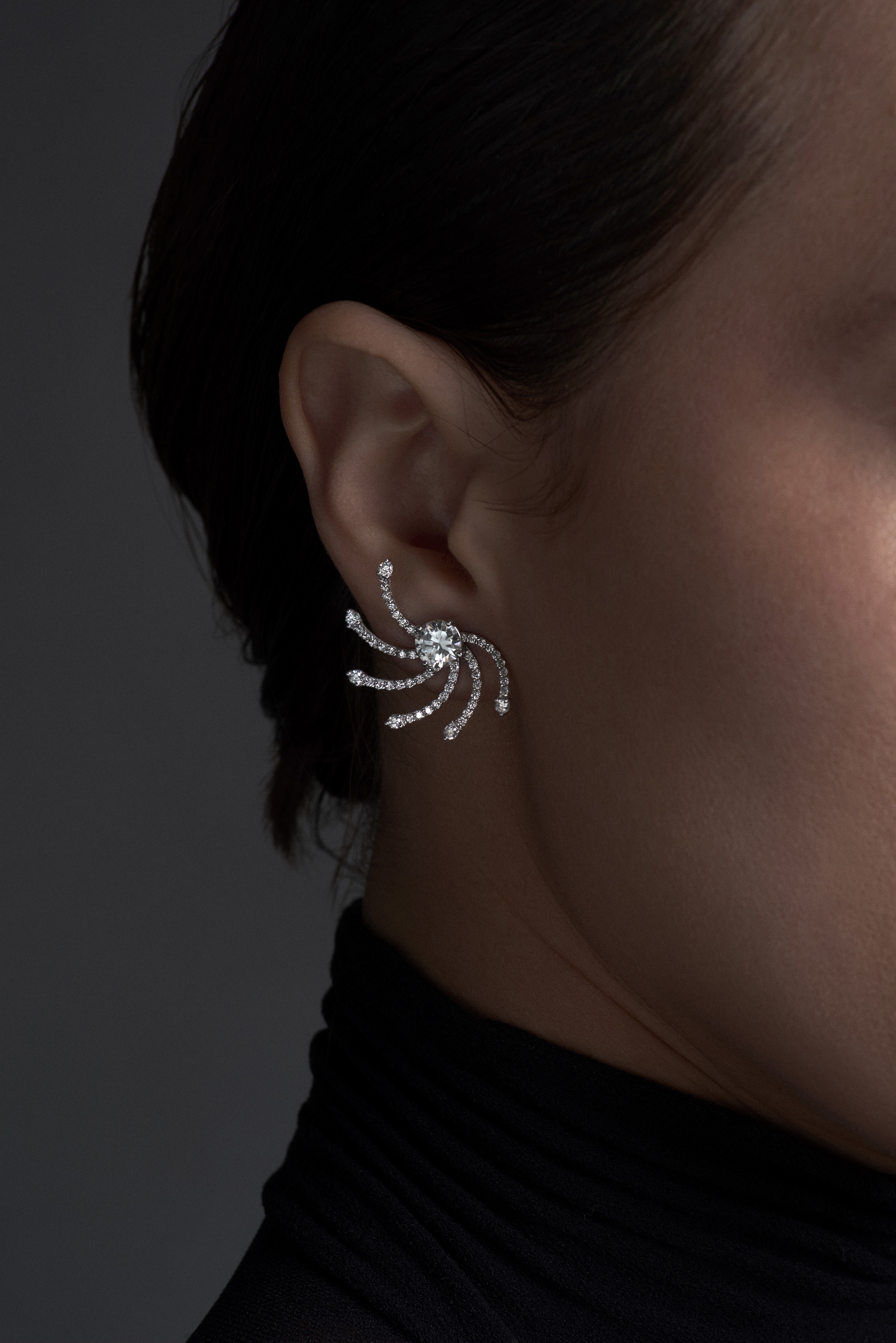 Haste pólen n em ouro branco 18k e diamante. O pólen é princípio e promessa. Minúsculo e leve, mas capaz de gerar flores, frutos e abundância. Ele simboliza o potencial escondido nas pequenas coisas a semente invisível do prazer e do amor que, quando partilhada, transforma-se em vida plena.